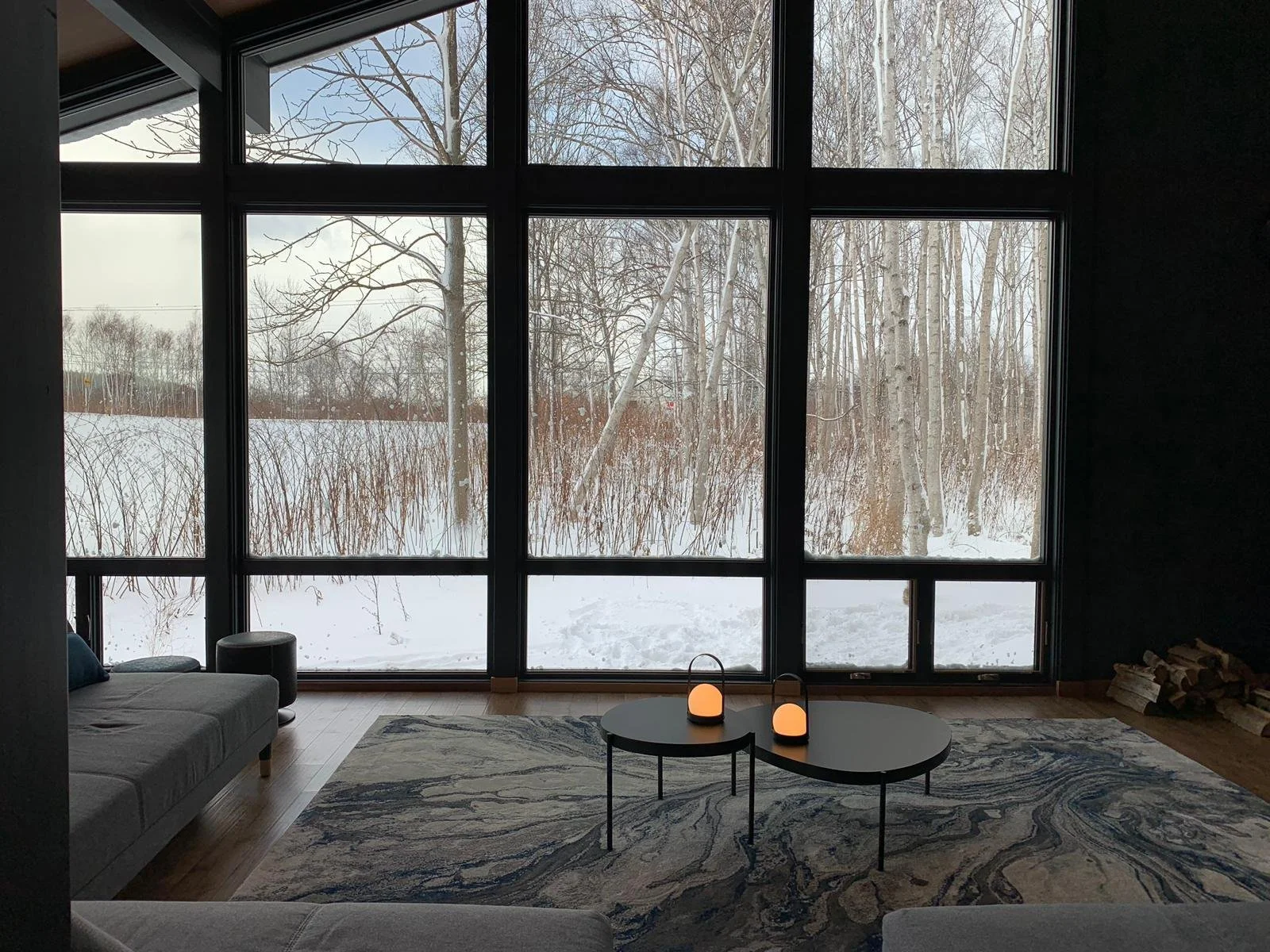 Enjoy conversations by the fireplace, with a view of birch trees and snow. In Hikari Chalet.